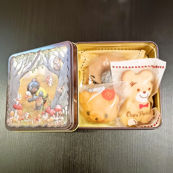 店頭に違うセットも並んでいますが、こちらはくまの缶に合わせてくまモチーフの焼菓子を詰め合わせました。