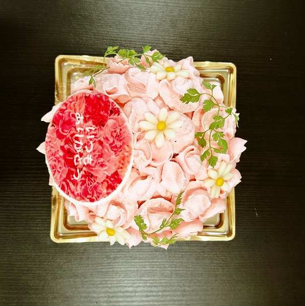 苺の生クリームで周りにお花を絞って仕上げています。白いお花はマジパンです。
