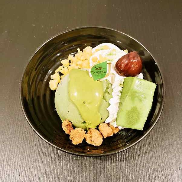 こちらは東京都瑞穂町の西村園の抹茶を使用したアイスで仕上げたミニデザートです。基本的にはパフェと同じ材料(生クリームや刻んだ栗、そぼろ状のクッキー)がありますが、抹茶のシフォンの代わりに葛練りというもっちりとした食感のスイーツを飾っています。こちらのスイーツも西村園の抹茶を使用して作っています。抹茶好きにもおすすめのスイーツです。