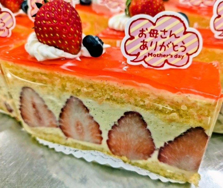 2025年の母の日から数量限定で販売しておりますこちらのフレジエはバニラ風味のクリームと国産の旬の生の苺をたっぷりサンドしたケーキです。1個税込648円で販売中です。香りづけにごく少量ですがアルコール(キルシュ)を使用しております。あらかじめご承知おきください。