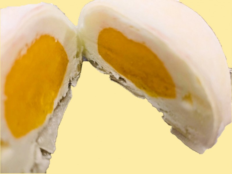 ミルクジェラートの中にオレンジカスタードを冷凍したものを入れて最後に求肥で包んでいます。1個税込400円です。