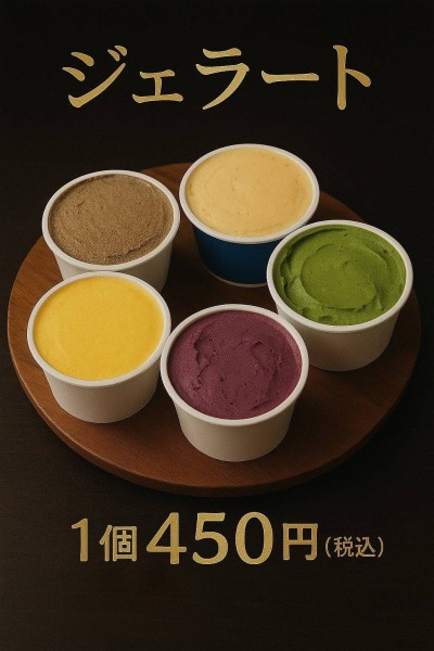こちらのカップに入っているジェラートは五日市にあるおかしはパージュさんが作っているジェラートです。タヒチ産バニラを使用したバニラジェラート、瑞穂町の抹茶を使用した抹茶ジェラートのほか、当店でお願いして作っていただいている沖縄県産マンゴーを使用したマンゴージェラート(こちらは数量限定)、青梅産のほうじ茶を使用したほうじ茶ジェラート、青梅産ブルーベリーを使用したブルーベリージェラートの5種類を販売中です。