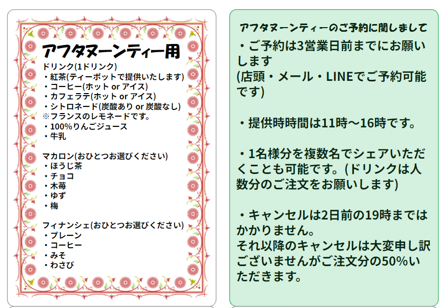 ドリンク・マカロン・フィナンシェのメニューとご留意点です。