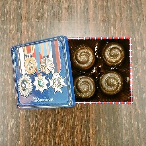 ほうじ茶ショコラは青梅産のほうじ茶を使用したジャム、ガナッシュをチョコレートでコーティングしました。4粒入りで1000円です。