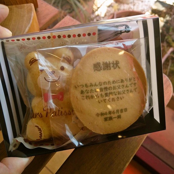 くまの形のマドレーヌ、パックのゼリー、そして、感謝の気持ちをプリントした感謝状クッキーをセットにしました。