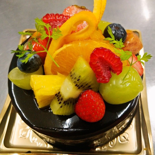 濃厚ショコラは通常フルーツはあまり飾っていませんが、ご注文いただければフルーツで飾ることができます。料金はフルーツをどの程度飾るかによっても変わりますが追加料金が324円~かかります。