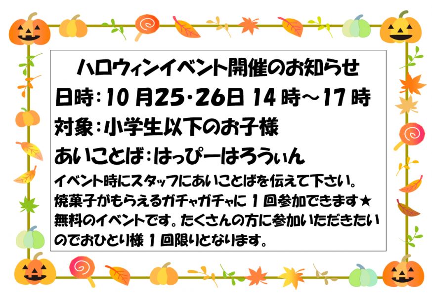 対象は小学生以下のお子様(小学6年生のお子様まで)です。あいことば「はっぴーはろうぃん」とスタッフにお伝えください。焼菓子がもらえるガチャガチャ1回チャレンジできますよ♪無料のイベントです。たくさんのお子様に参加いただきたいのでおひとり様1回限りの参加でお願いします<(_ _)>