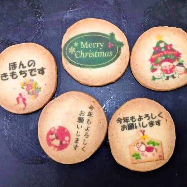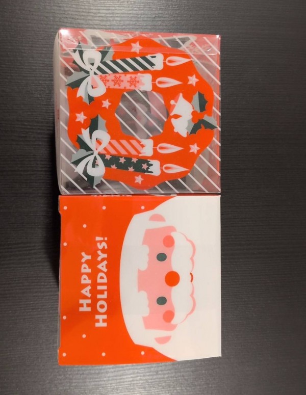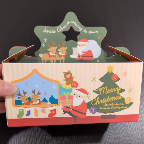 こちらは立方体の箱です。クリスマスモチーフのイラストが描かれています。焼菓子も6個程度入ります。中身がちらっと見えるケースなのでよりワクワク感も出ますね。こちらは330円で販売しております。