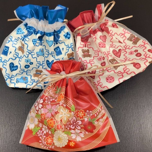 こちらは焼菓子が4~6個ほど入る大きさのきんちゃく袋です。くまの柄は赤と青のタイプがあります。年末年始にもおすすめの和柄タイプもありますよ★各1袋220円です。