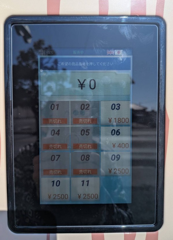 ご希望の商品の番号を押してください。その後ご希望のお支払い方法で支払いを済ませていただくと商品が出て参ります(少しゆっくりです)。