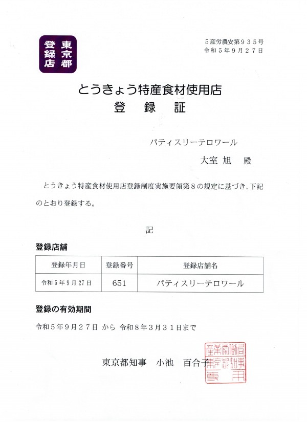 ▲青梅のケーキ屋「パティスリーテロワール」登録証